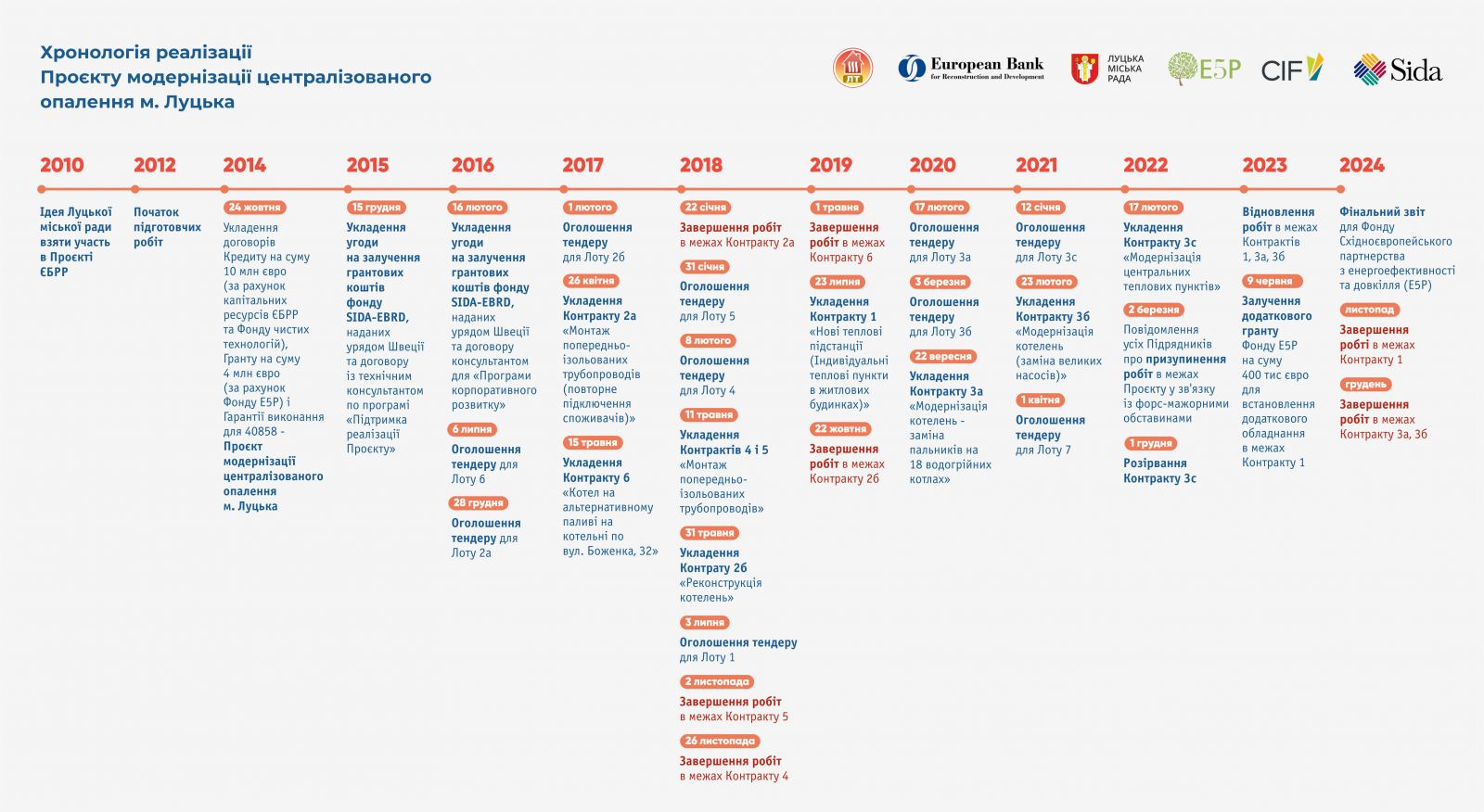 2010 рік – в Луцької міської влади з’явилася ідея взяти участь в проєкті Європейського банку реконструкції та розвитку з модернізації сектору централізованого теплопостачання в декількох містах України. В дуже стислі терміни в ДКП «Луцьктепло» готуються документи на подачу заявки на участь в проєкті. Минає період тиші і настає момент істини – серед інших міст Луцьк відібраний для кредитування модернізації системи централізованого теплопостачання. Залучені 10 млн євро кредиту (за рахунок капітальних ресурсів ЄБРР та Фонду чистих технологій), 4 млн євро гранту (за рахунок Фонду Східноєвропейського партнерства з енергоефективності та довкілля (E5P)) покликані кардинально змінити технічний стан підприємства, а додатковий 1 млн євро гранту (наданих урядом Швеції через фонд SIDA-EBRD) фінансує консультаційні послуги для сприяння ефективного освоєння коштів.