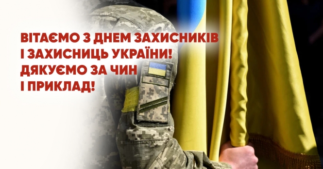 Прийміть щирі вітання зі святом, яке символізує вашу мужність, честь та любов до Батьківщини. Дякуємо за вашу відвагу, самовідданість і жертовність. Бажаємо непохитного здоров’я, сили та незламності духу.