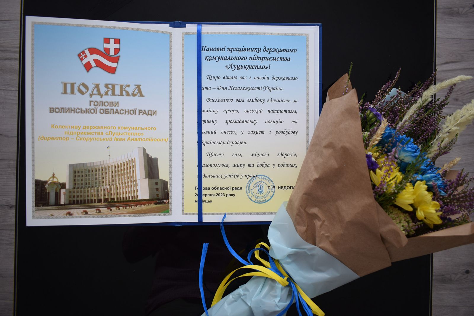 Також з приємністю повідомляємо, що з нагоди державного свята – Дня Незалежності України, колектив ДКП «Луцьктепло» цьогоріч було удостоєно подякою голови Волинської обласної ради Григорія Недопада: «Висловлюю вам глибоку вдячність за сумлінну працю, високий патріотизм, активну громадянську позицію та вагомий внесок у захист і розбудову Української держави».
