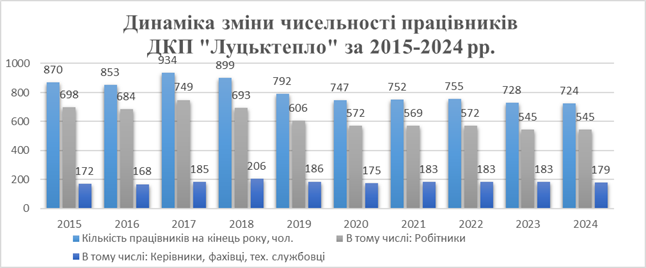 За останні роки на підприємстві спостерігається стійка тенденція до зменшення чисельності працівників (за винятком її зростання в 2017 році після прийому працівників, що обслуговують котельню на вул. Корсака Івана, 2). За останні 10 років чисельність персоналу підприємства знизилась на 17 %.