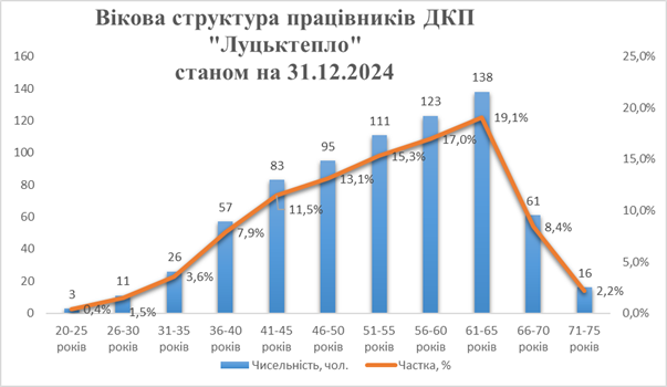 Станом на 31.12.2024 на підприємстві працює 33 % працівників пенсійного віку, незначна (в межах 1,9 %) частка молоді до 30 років, зокрема, випускників різних навчальних закладів.